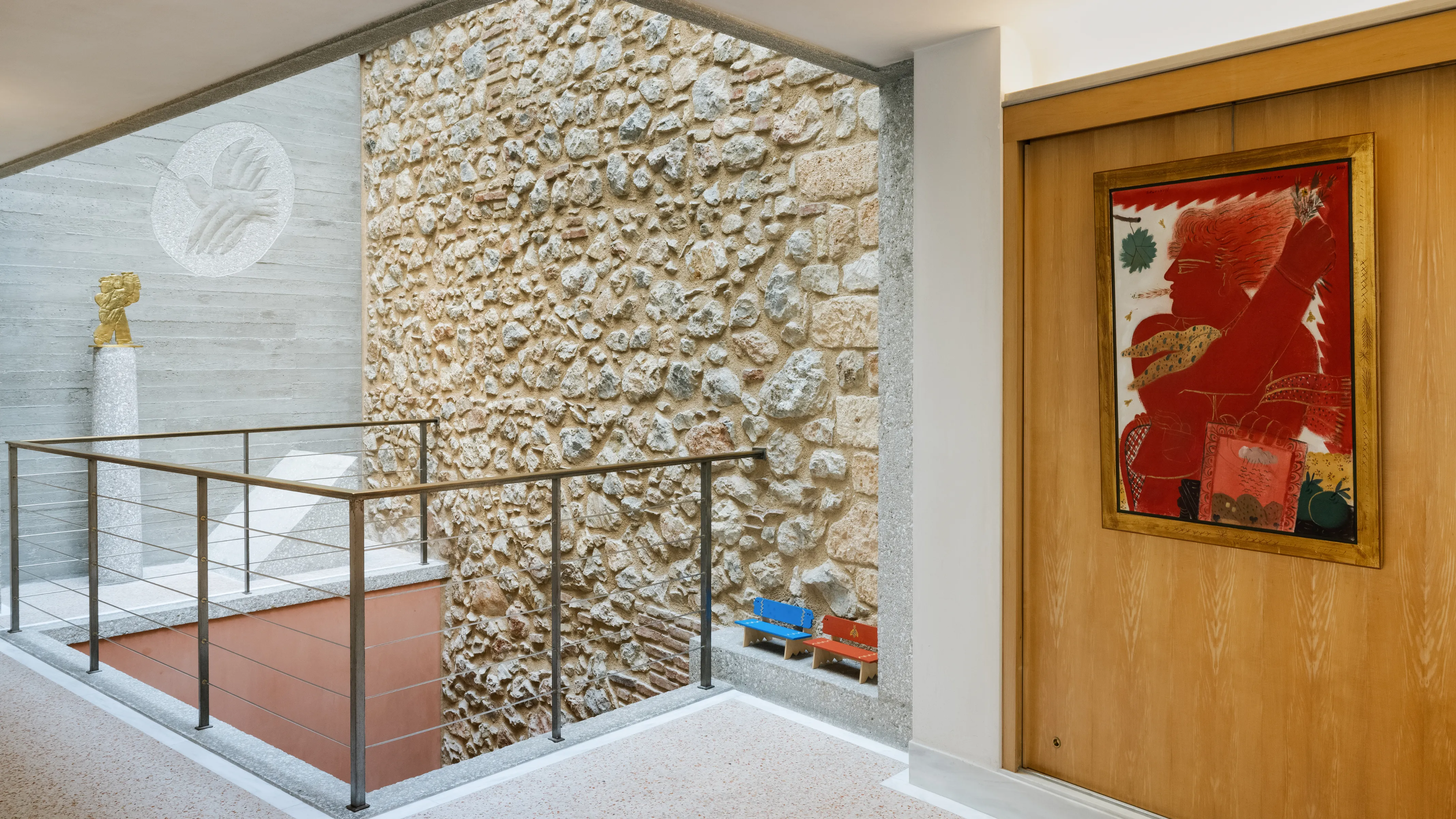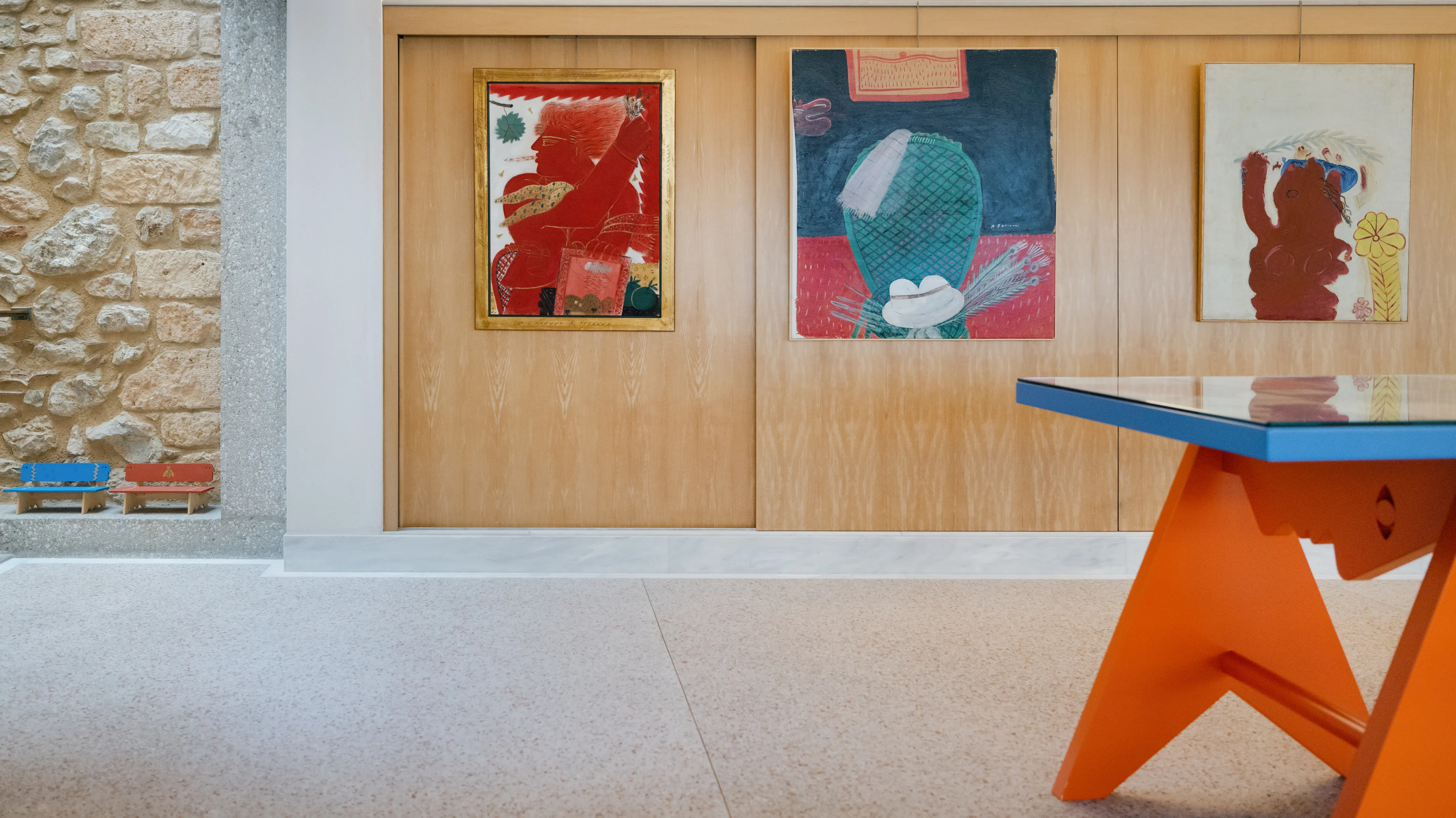 The museum is a “total artwork”—a true collaboration between artist and architect. Fassianos curated every detail: door handles, frescoes, hand-painted furniture. The exhibition introduces visitors to all the art forms he practiced. Visitors see early works from the 1950s to 2010, including cubism experiments, abstract expressionism, figurative work, design, archival letters, and never-before-seen materials.