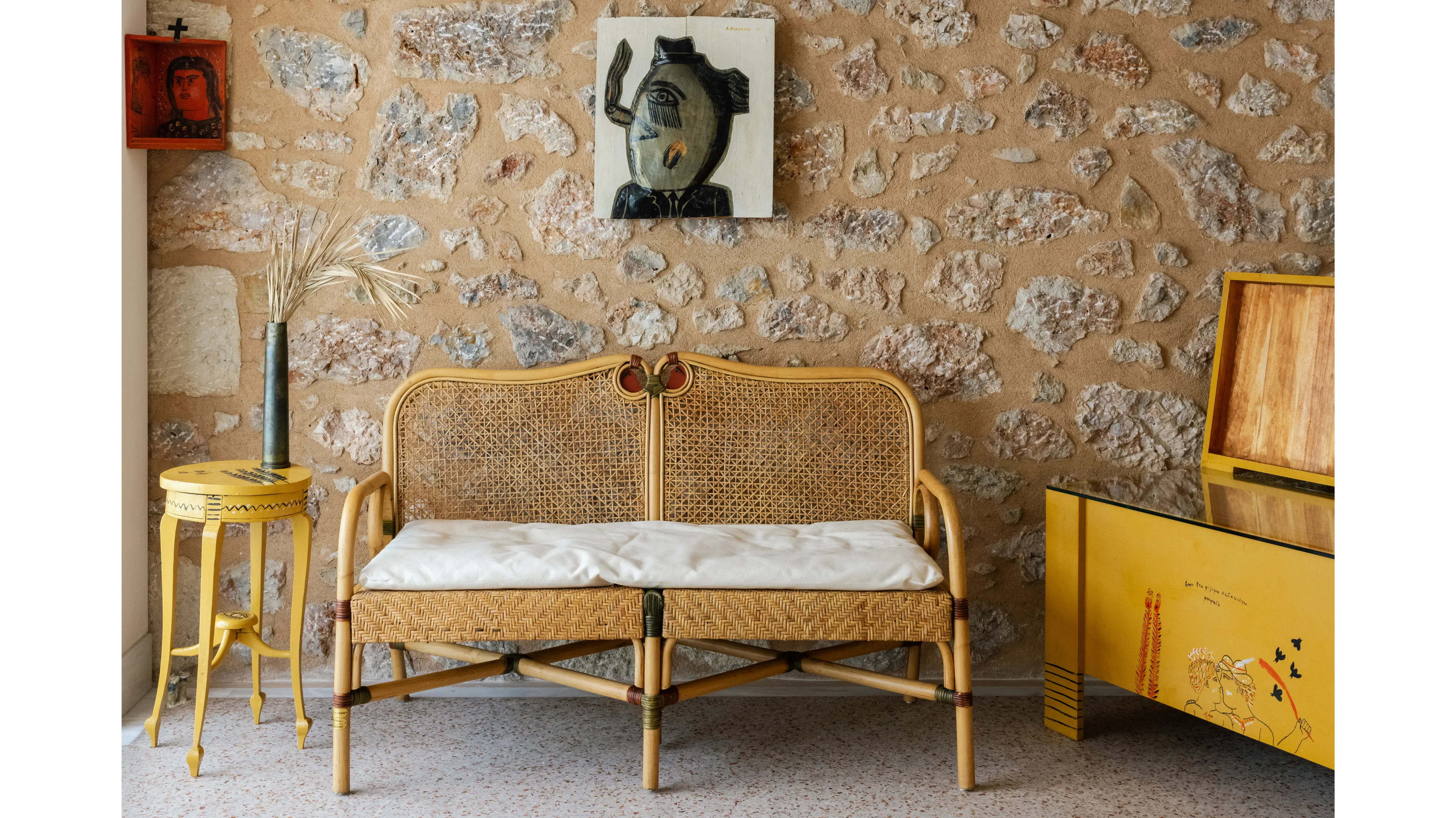 The Kea atelier reveals Fassianos' ascetic way of life. The home remains intact with his handcrafted toys, ceramics, clothes, and personal items. This was a summer retreat where he welcomed artists and writers including Louis Aragon, Niki de Saint Phalle, Yannis Tsarouchis, and Jean Tinguely.